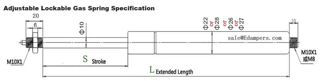 Lockable gas spring is also called controllable gas spring. According to the different locking medium, it can be divided into two categories: elastic locking and rigid locking. The elastic locking medium is gas, and the rigid locking medium is liquid, because the liquid is incompressible, the gas spring will get a relatively high locking force value after locking, and the displacement can be ignored, so it is called rigid locking. Due to the difference in structure, rigid locking gas springs can be made into tensile rigid locking, compressive rigid locking and bidirectional rigid locking. In order to meet the requirements of different working conditions. |